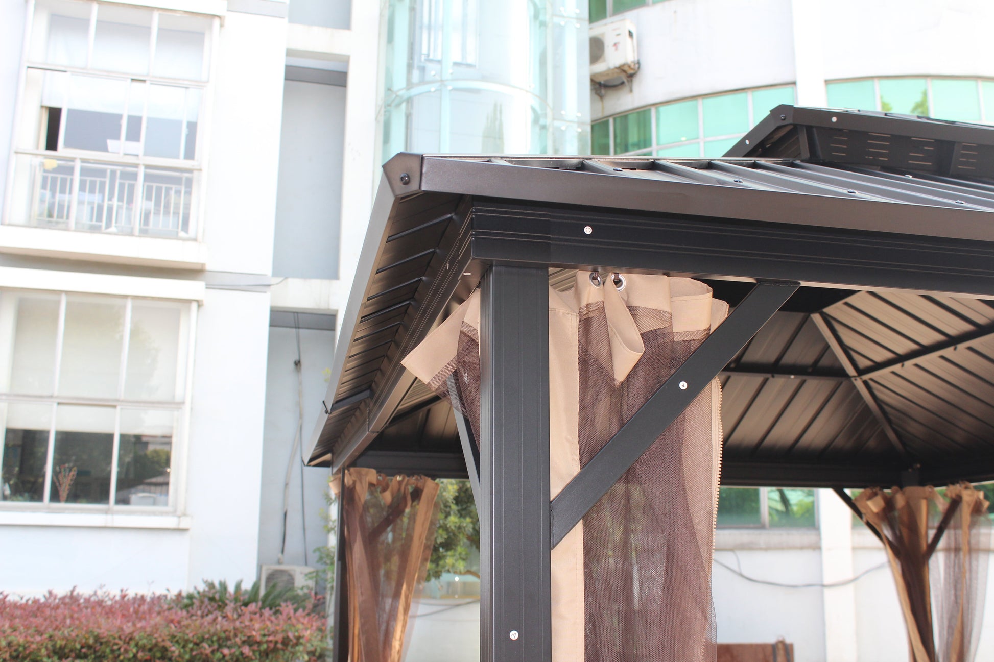Ainfox 10x12ft patio gazebo has elegant appearance with two tier tops. The thin Mosquito protect you from bites. Providing a cozy shaded space for relax in summer. Become a First-selected place for friends and families to gather for parties, games, conversations. The gazebo is supported by powder-coated aluminum frame to have a strong foundation. And the double-roof is made of Galvanzied steel plates, Which is waterproof and UV protection. Very durable, stable and safe.
