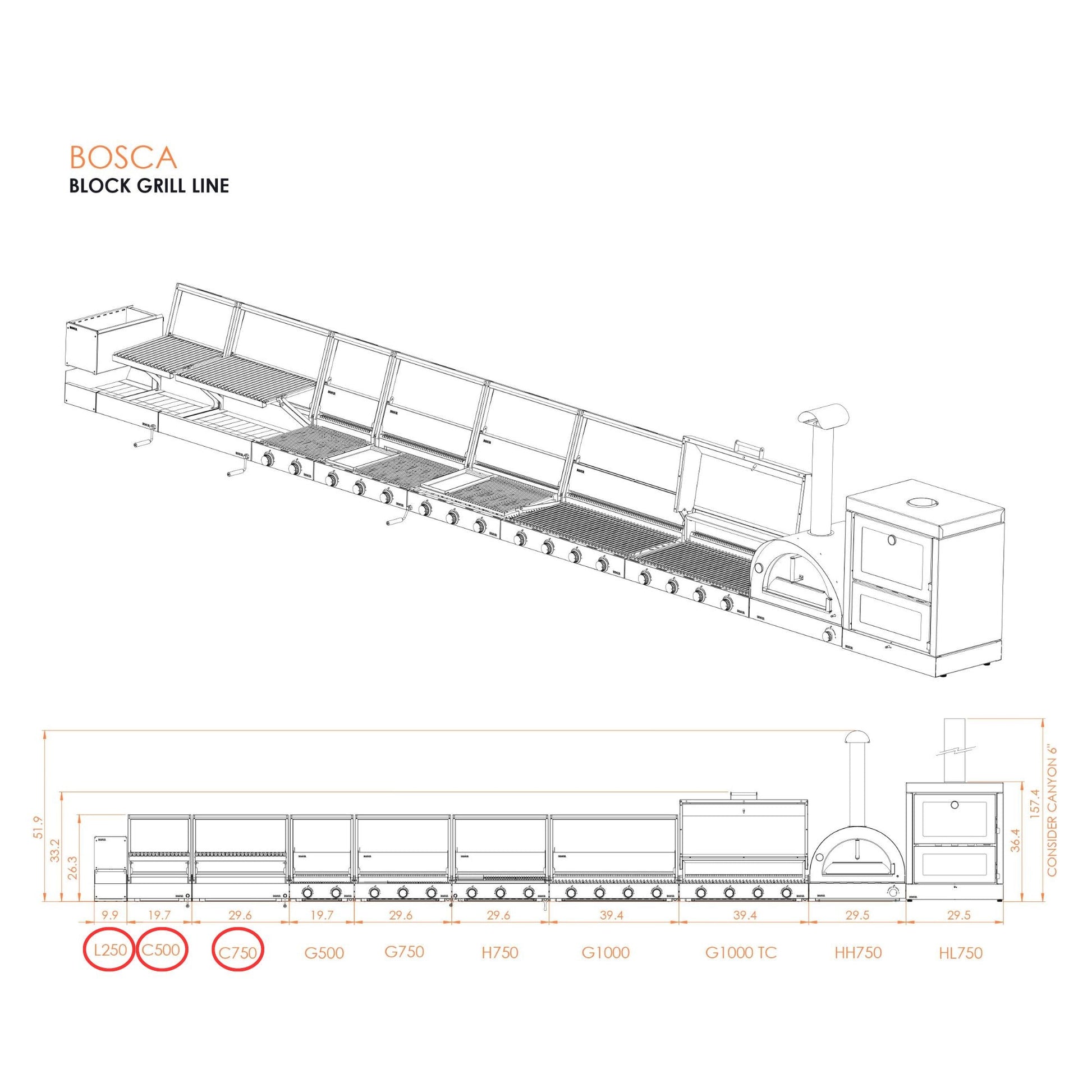Bosca Pack Block Wood Brazier 250 + Block 500 20" Built-in Charcoal Grill + Block 750 30" Built-in Grill