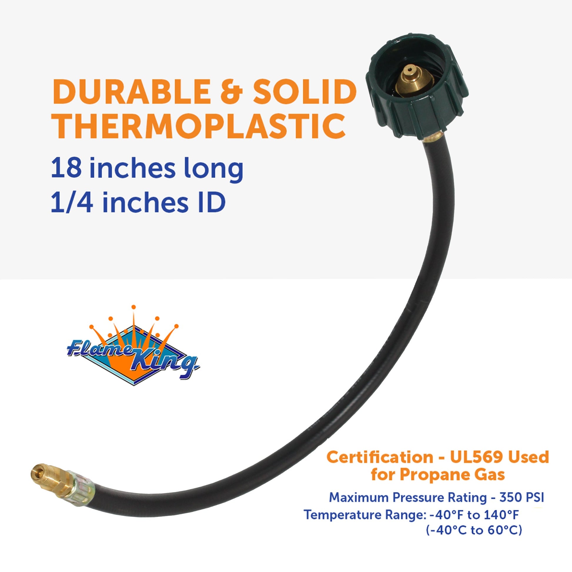 The Flame King 18-inch Pigtail Propane Hose Connector is built to deliver a secure, dependable connection between your propane tank and RV or trailer regulator. Compact yet powerful, it's rated for 200,000 BTUs per hour, ensuring steady fuel flow to keep your adventures running smoothly.