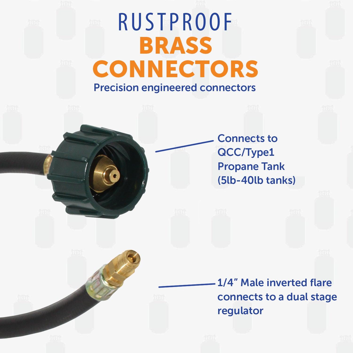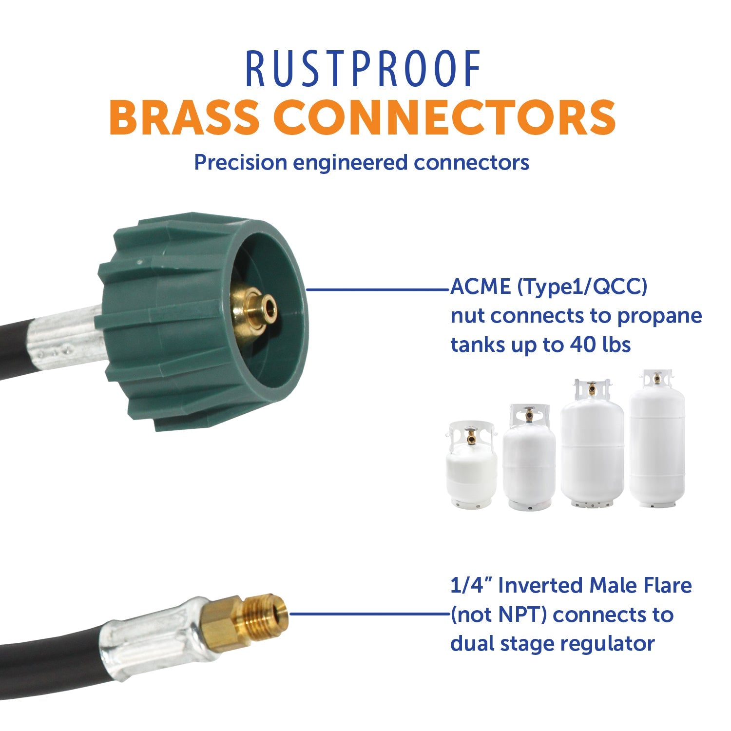 Designed with an ACME (Type 1/QCC) nut x 1/4" inverted male flare fitting, this pigtail hose easily connects 5 lb-40 lb refillable propane cylinders to an RV regulator or a 4-port brass tee. It's the perfect solution for extending your propane supply or setting up an auxiliary line when you need it most.