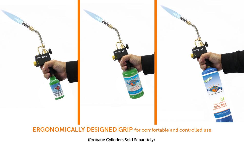 The ergonomic grip ensures steady handling and comfortable use, even for extended projects. Its secure CGA600 connection fits perfectly with Flame King's 1/4LB and 1LB refillable propane cylinders (sold separately), as well as standard 1LB propane, MAPP, and MAP-PRO cylinders-giving you fuel flexibility and convenience.