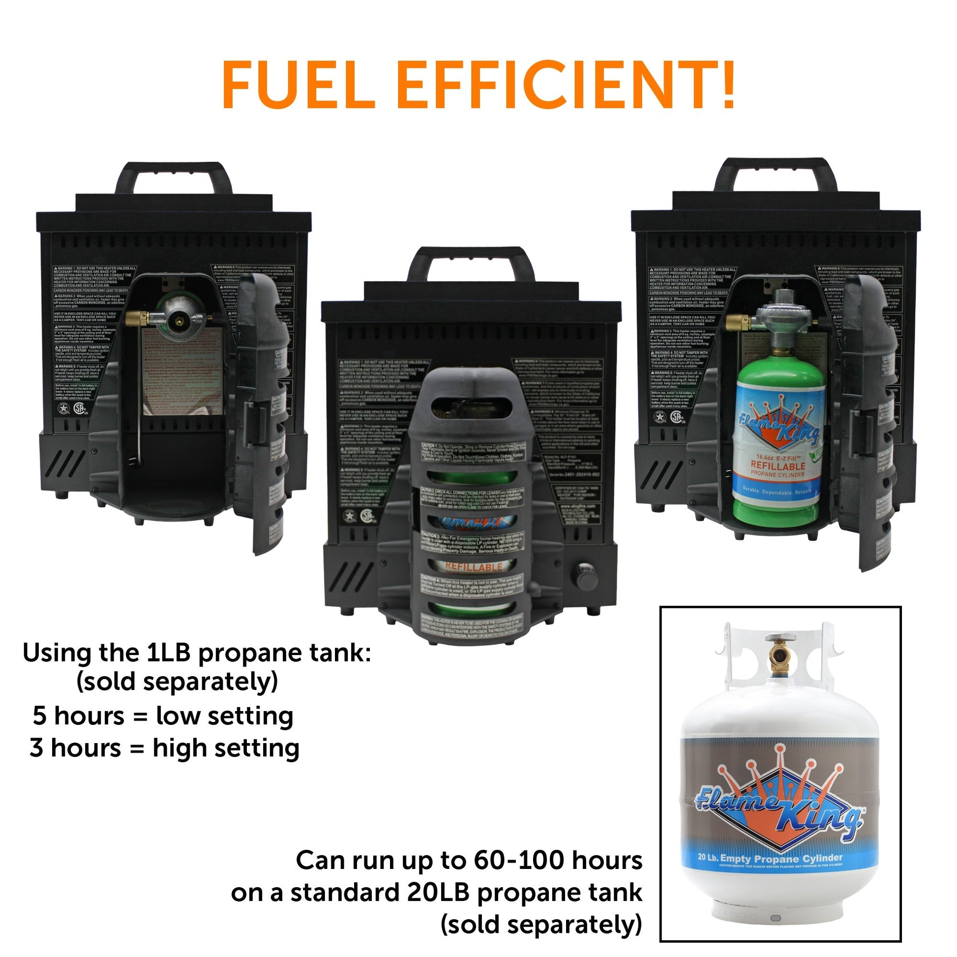 Create a warm and cozy outdoor setting for your friends and family get-togethers with realistic dancing flames like a fireplace! The Flame King Alogfire Propane Ambiance Log Fireplace is compact and portable with an easy-grip handle designed to bring great ambiance to almost any outdoor setting - patio, garden, garage, outdoor bar, tents, porches, decks, and more. Fireplace emits CLEAN and SMOKELESS flame, providing 5 hours of warmth on the low setting and 3 hours on the high setting maxing at 8,200 BTU. It can run up to 100 hours on the low setting and 60 hours on the high setting using a standard 20LB tank and heats up to 300 SQFT of space. Equipped with a high-quality electric igniter, it offers quick, safe ignition without needing matches or lighters. Push igniter to spark the pilot, then turn the knob to begin heating immediately - battery not included! Like you, we believe SAFETY is the top priority, therefore we have designed this Propane Fireplace with MULTI-PROTECTION systems. For your peace of mind, this Fireplace is made from flame-retardant materials, equipped with flameout protection (accidental blowout safety shut-off), tip-over safety shut-off, and low-oxygen safety shut-off. When connecting to a 20LB propane tank; it is very important to note that the tank must be placed outside; propane hose and accessories are available as a separate purchase. CERTIFIED BY CSA TO ANSI INTERNATIONAL REQUIREMENTS.