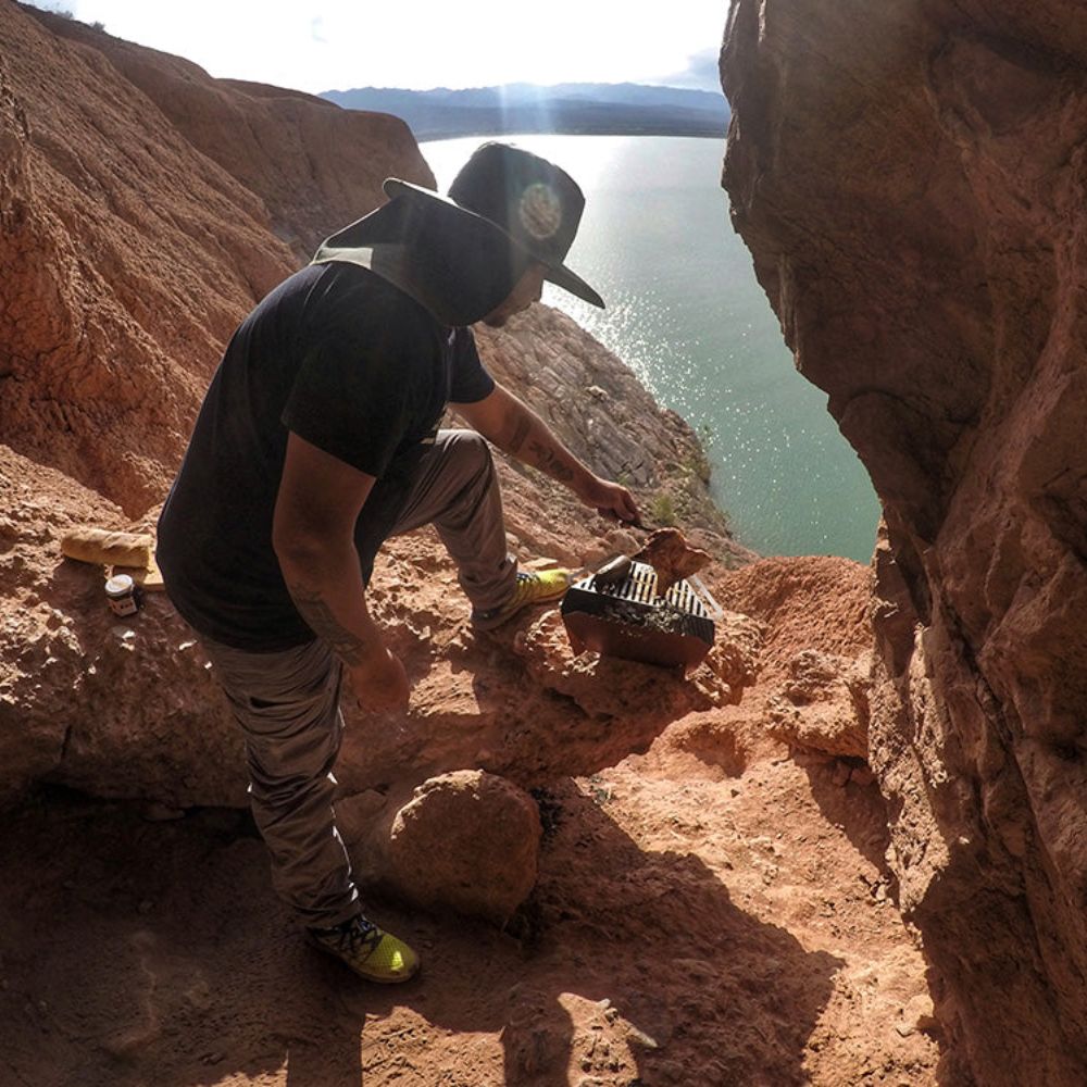 The Nuke 300 Fire Pit Grill is a portable, compact fire pit that doubles as an open-fire grill. Perfect for camping and outdoor adventures, this durable steel fire pit folds flat for easy storage and transport, even fitting in a backpack. Once the fire dies down, you can quickly transform it into a grill for cooking your favorite foods.