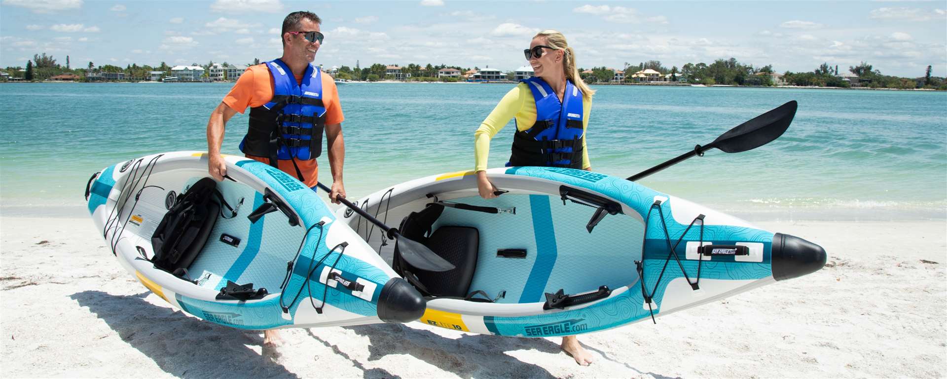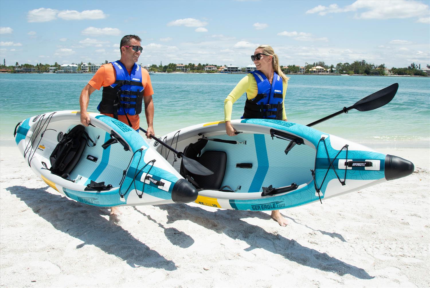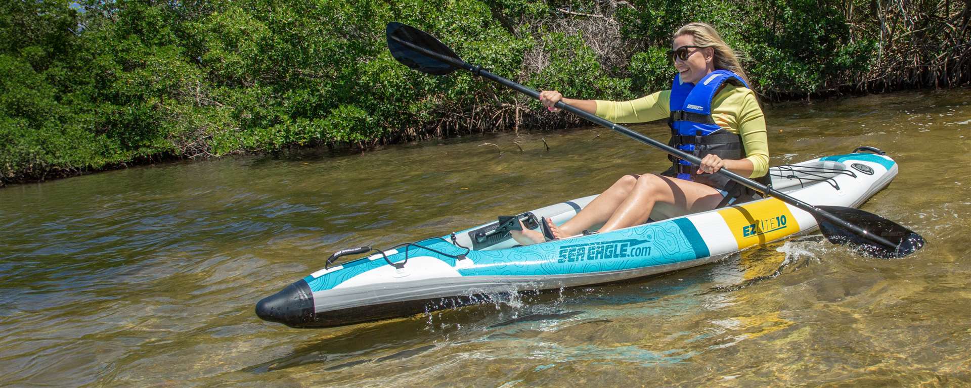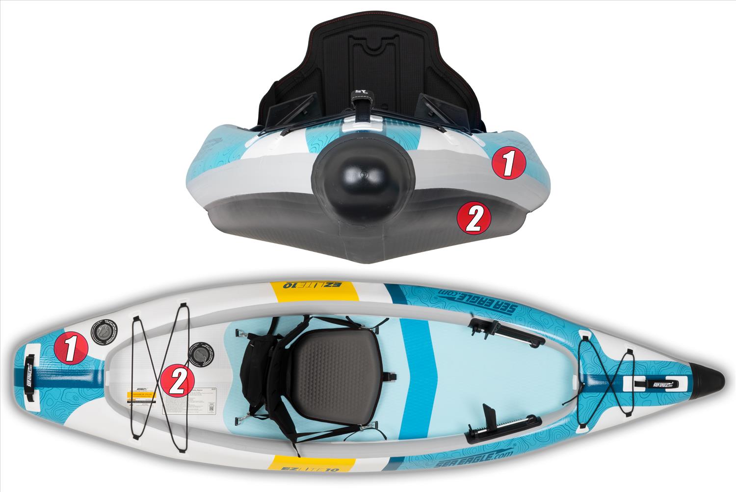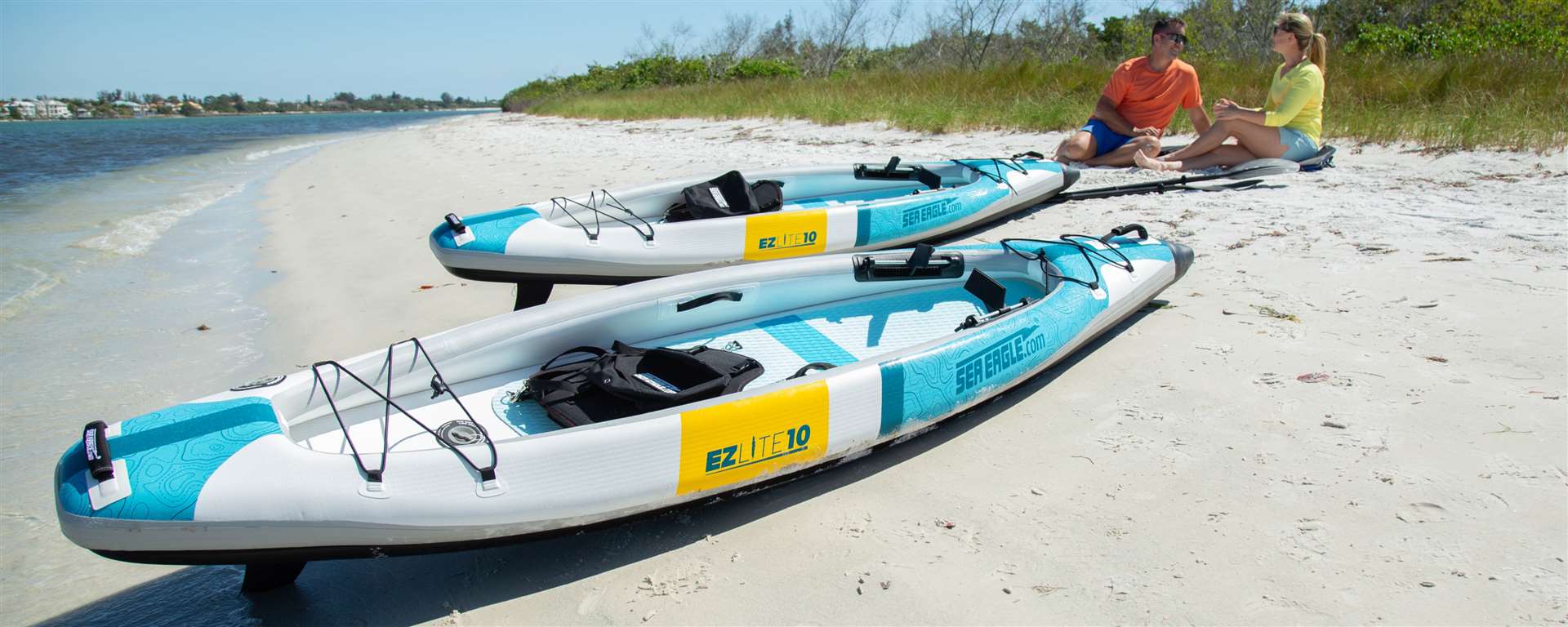 NEW Sea Eagle® EZLite Inflatable Kayak - This new ultralight, high-performance kayak features all-woven-drop-stitch - a new lighter stronger DS material, V-bottom high-pressure rigid drop-stitch-floor for superior performance, handling, and paddling, and the NEW FlexBrace2 with NEW EZ-Install feature! New lever-action rods make removing rods & pedals quick and easy for compact storage.