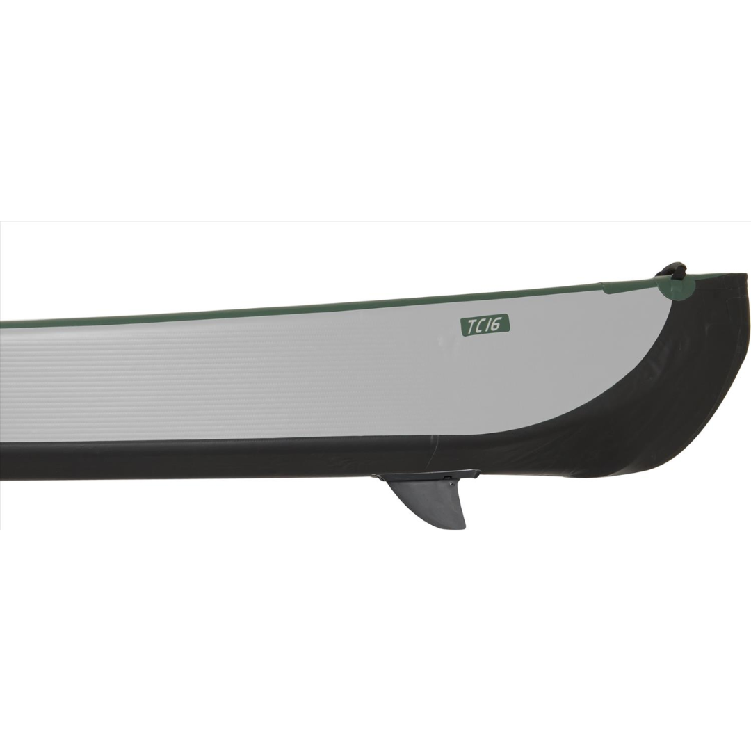 The TC16 has accomplished feats well beyond reach of traditional canoes. It is a completely buoyant and unsinkable canoe, easy to upright and re-enter from the water, 33% lighter than comparable canoes, has incredible primary and secondary stability (stable to stand in), bow/stern molds that slice through the water, full length flat planing surface area for additional speed, designed to create lift and reduce drag, entire hull waterline length enabling paddling speeds up to 5 mph, full length double chine system and removable rear skeg to enhance tracking and increase stability, three separate air chambers for additional safety and is rated for up to Class IV whitewater.