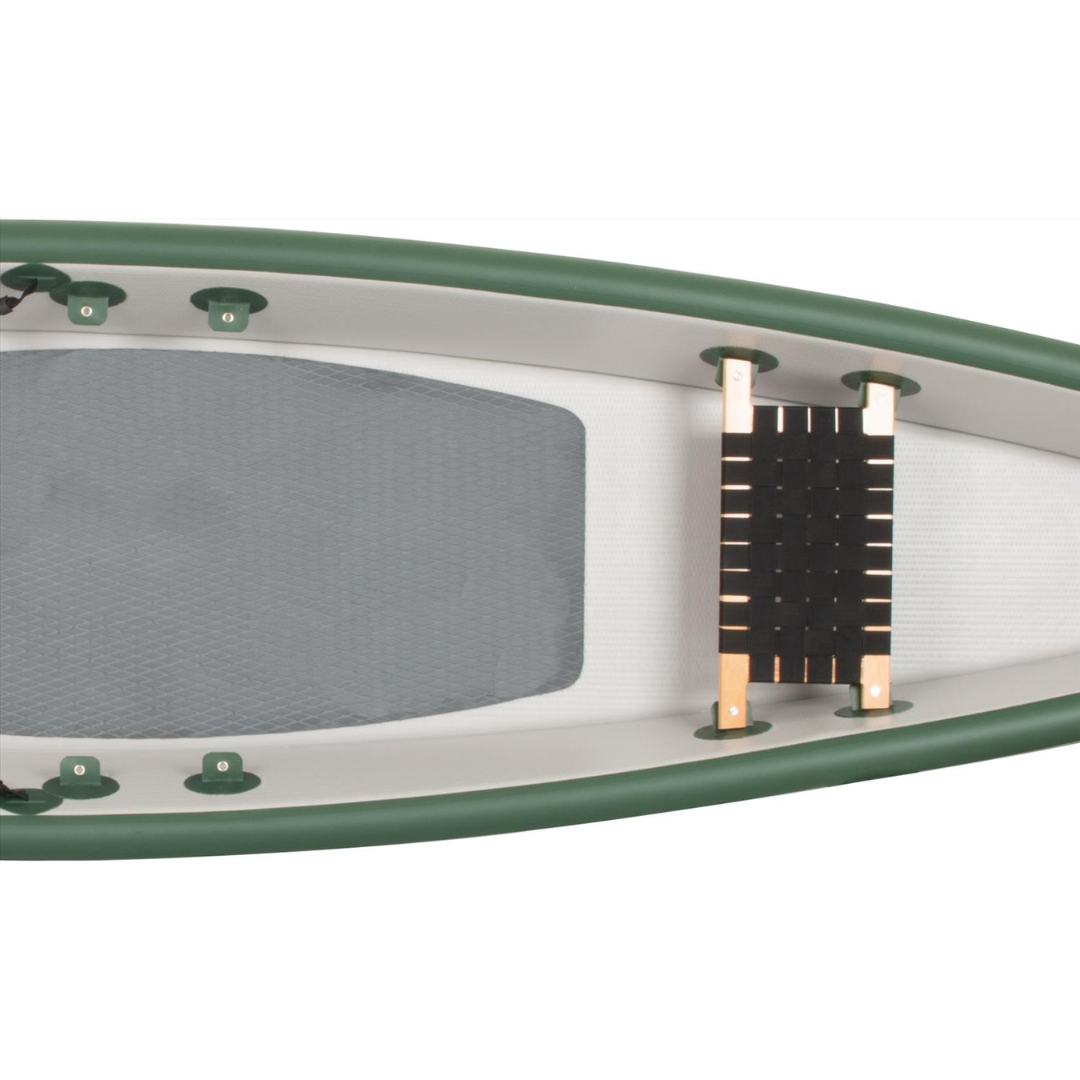 To provide safe and secure footing when getting in and out of the Travel Canoe we have added a layer of diamond pattern anti-skid EVA foam decking. This not only makes this canoe safer to stand on (especially when fishing and casting) it adds an additional layer of protection to the floor. To secure the optional drop stitch inflatable seats while providing maximum adjustability (for one, two or three paddlers) additional d-rings have been added to hold a durable nylon strap that keeps the seat in place.