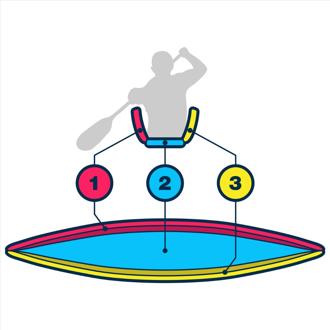 The flat three inch thick high pressure (up to 10 psi) side and floor chambers create a narrow, rigid and extremely spacious canoe. This construction system allows us to literally reinvent the traditional canoe in a unique inflatable form and provides previously impossible benefits. Greater safety, incredible stability and incomparable portability with no sacrifice to paddling performance. U.S. Patent 9,452,809