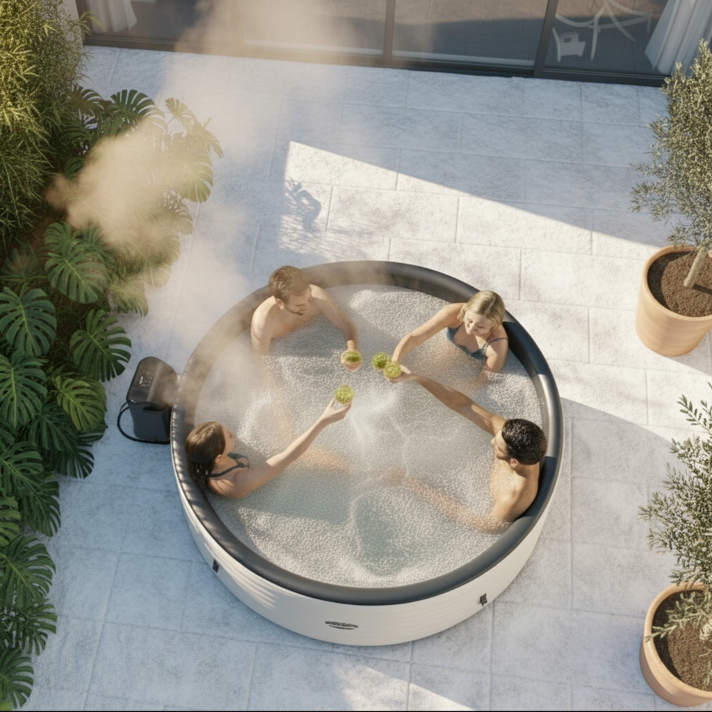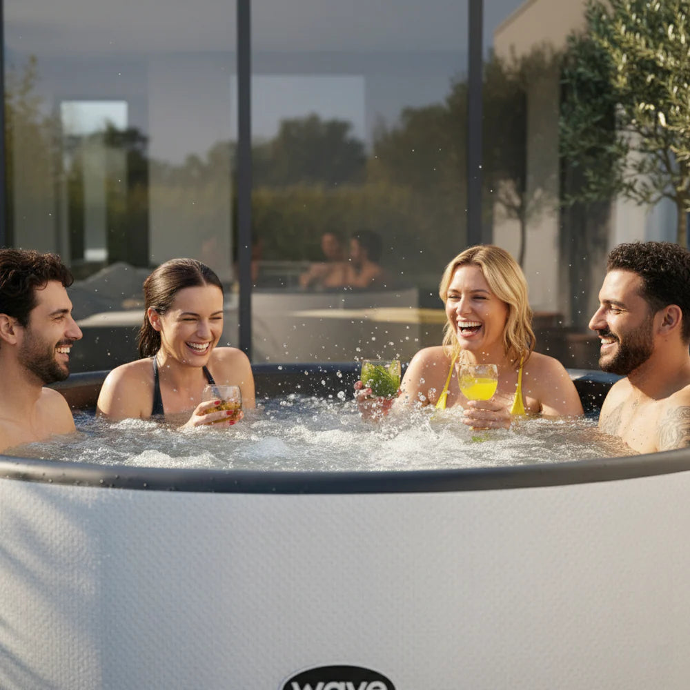 Stay warm in style this winter with the Wave Ontario 4-6 Person Round Drop Stitch Hot Tub. Built for comfort and durability, this premium inflatable tub brings a chilly-night retreat to life with Drop Stitch technology for a sturdy, rigid-wall feel while keeping the ease of portability. Picture friends gathering under a frosty sky, steam curling as they enjoy powerful massaging air jets, an energy-efficient heater, and a chic herringbone exterior—a cozy hydrotherapy haven for families, couples, or friends.
